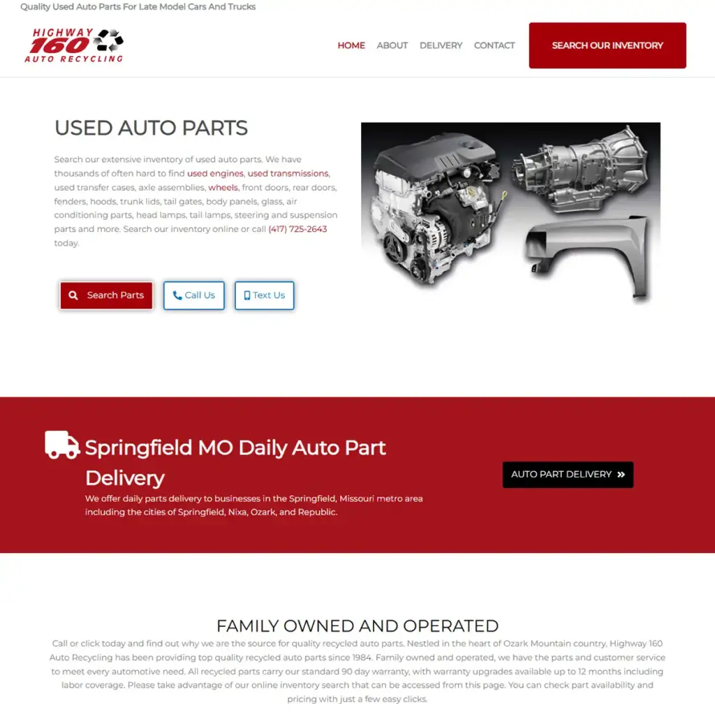 Web Marketing Services, LLC has partnered with Highway 160 since 2009. In addition to web development, Web Marketing Services, LLC has helped to manage Google Ads campaigns. In 2018, the site was redesigned with a special focus on SEO. The techniques used to achieve SEO success on the 160autosalvage.com site were featured in a talk entitled “Reaching More Customers With Search Marketing” presented at the Gateway To The Future convention and trade show. Slides for the talk can be downloaded from Facebook.com.