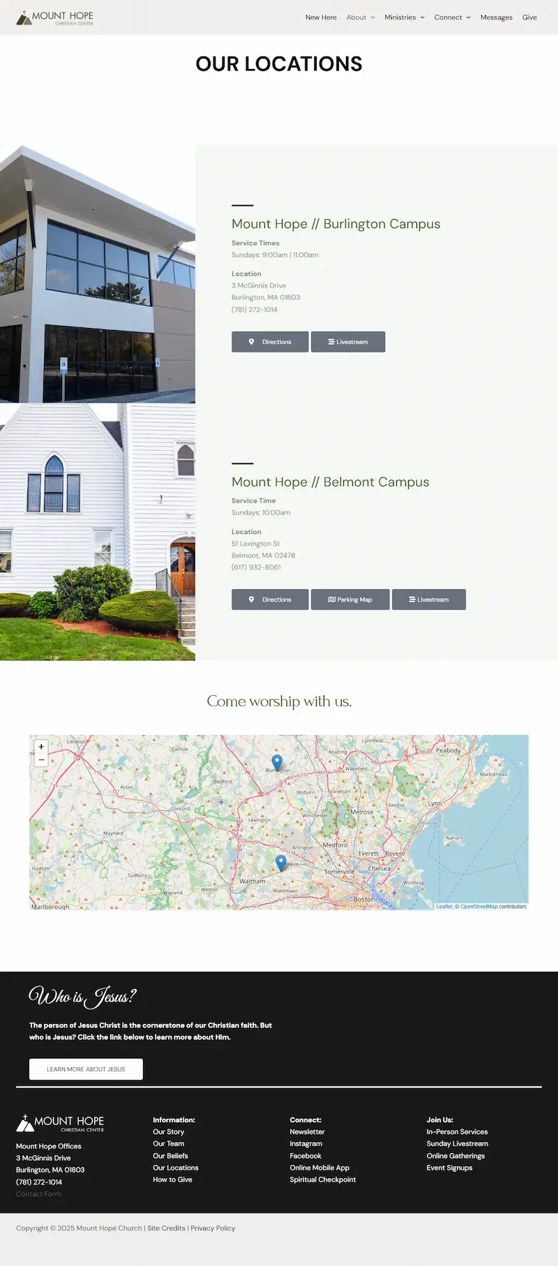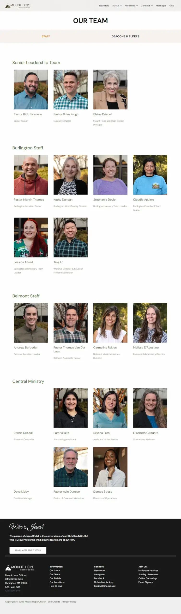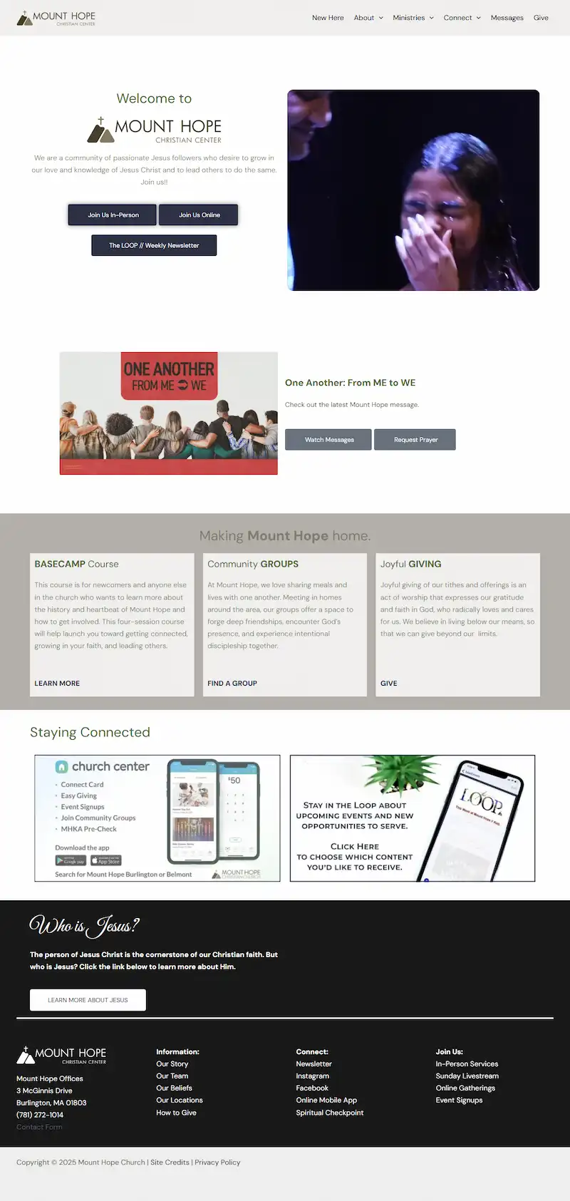 Located in Burlington, MA, Mount Hope Christian Center is a church with 2 campuses. Mount Hope has been a client since 2003. During that time, WMS has partnered with them on multiple redesigns of their main site.  WMS also worked with them on the development of a new site for their school.